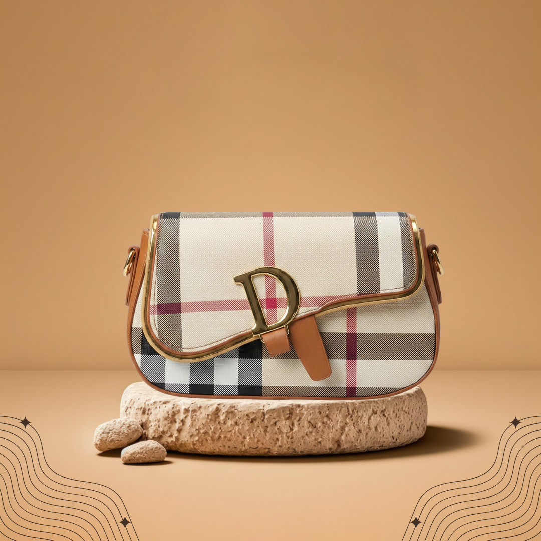 Beige Plaid Flap Shoulder Bag with Gold Detail