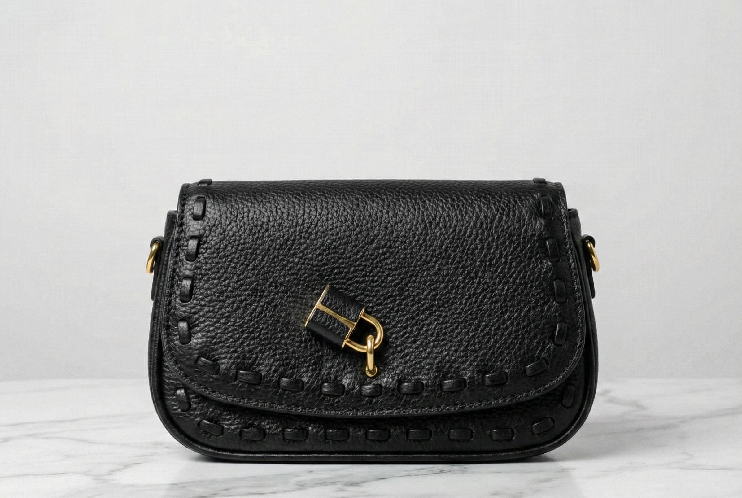 Black Leather Style with Stitched Detailing and Gold Clasp