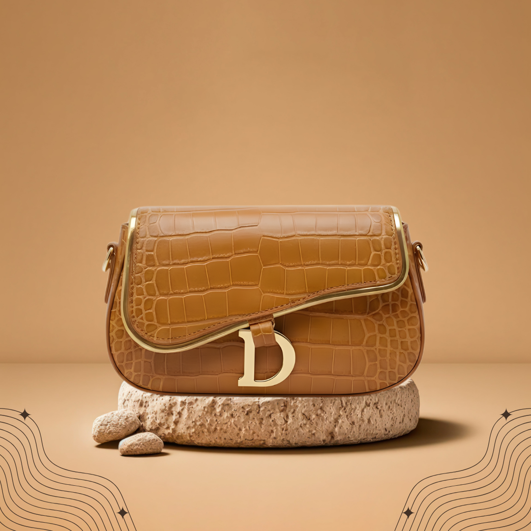 This brown croc-embossed shoulder bag showcases a structured form with a distinctive gold-tone D-shaped front detail. Finished with smooth edges and a comfortable shoulder strap, it offers timeless style with a luxurious texture.