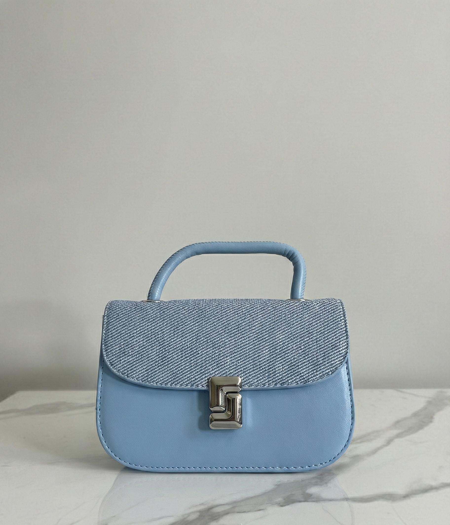 Chic Light Blue Leather Box Bag with Grey Canvas Top